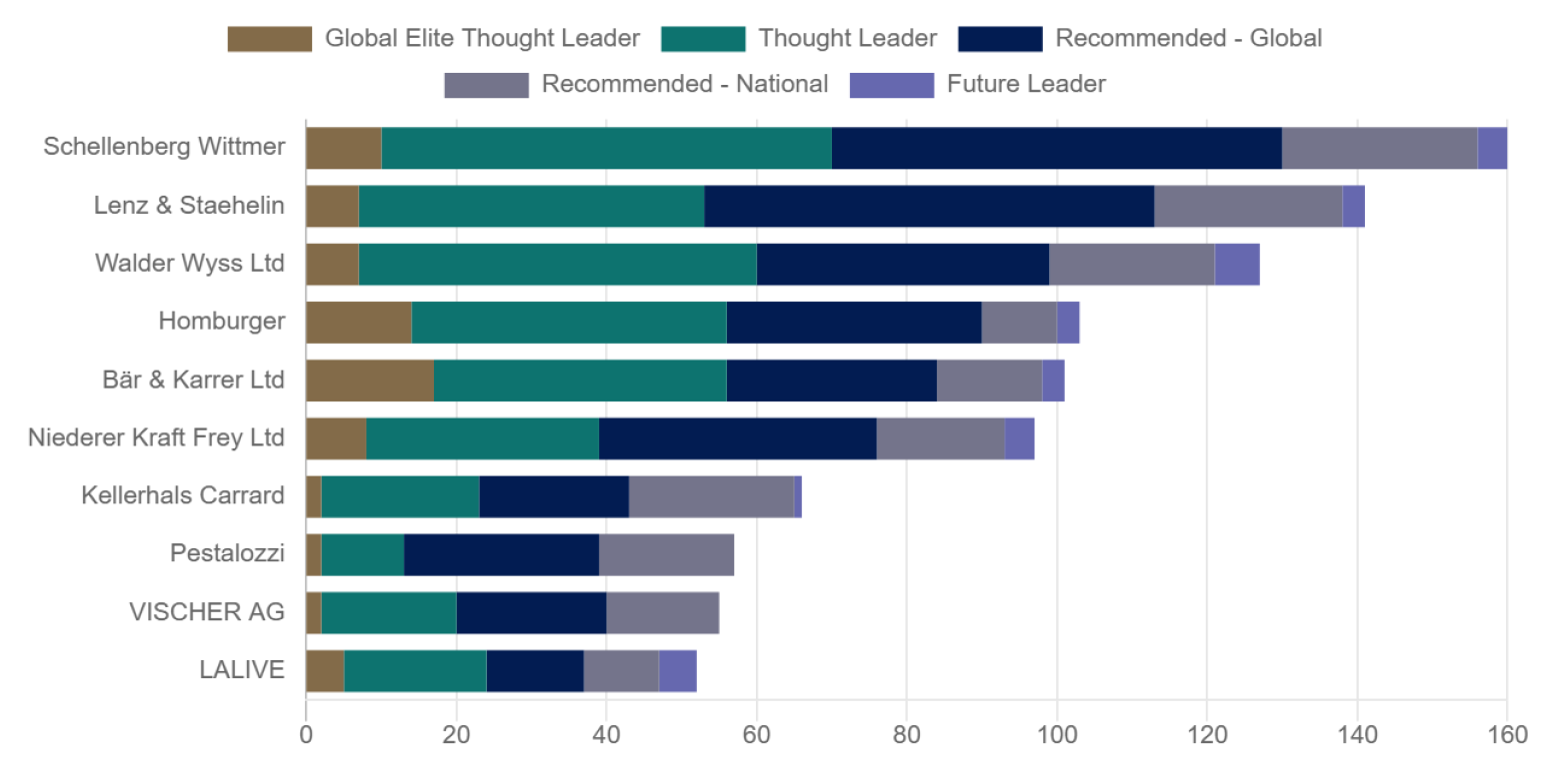 Pour la deuxième année consécutive, notre étude compte le plus grand nombre d'avocats classés parmi toutes les études d'avocats suisses. Les performances solides de nos avocats dans tous les domaines d'activité soulignent notre position de leader sur le marché suisse et renforcent notre réputation d'étude de premier plan.
